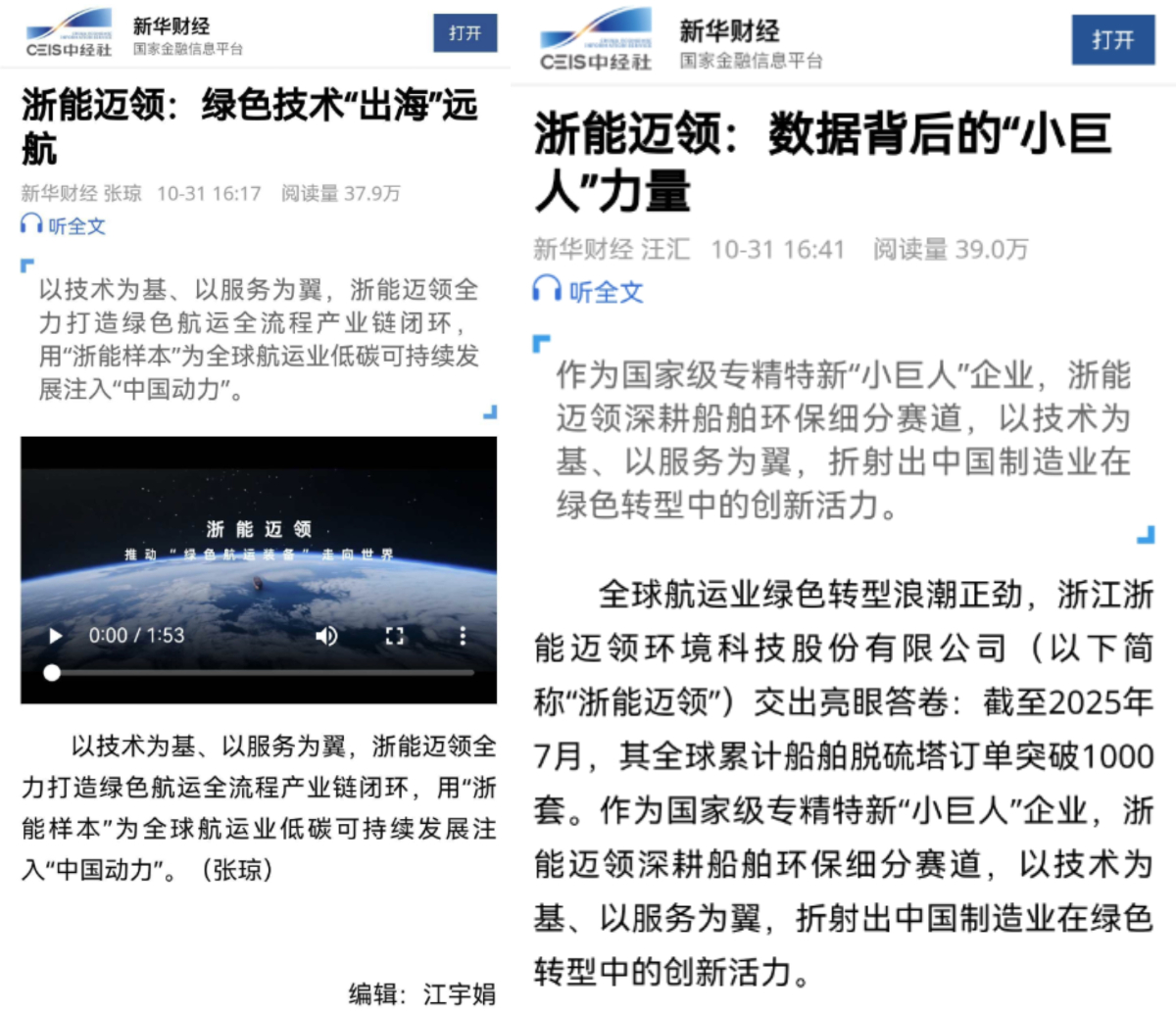 近日,新华社快看视频号、新华社客户端、新华财经客户端等平台聚焦报道浙能迈领以技术为基、以服务为翼,全力打造绿色航运全流程产业链闭环的实践与成就。