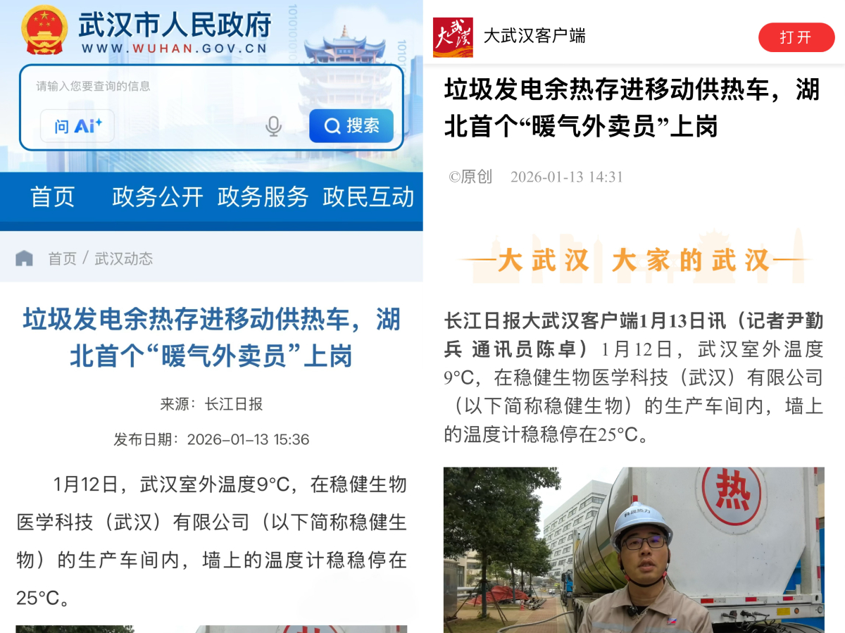 武汉市人民政府、长江日报大武汉客户端发布文章《垃圾发电余热存进移动供热车,湖北首个“暖气外卖员”上岗》。 锦江环境 提供