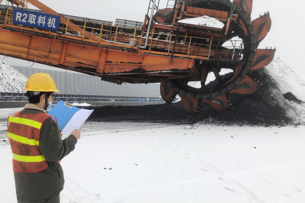 浙江越华驻曹妃甸港青年在冰天雪地中巡查煤场。 董得明 摄