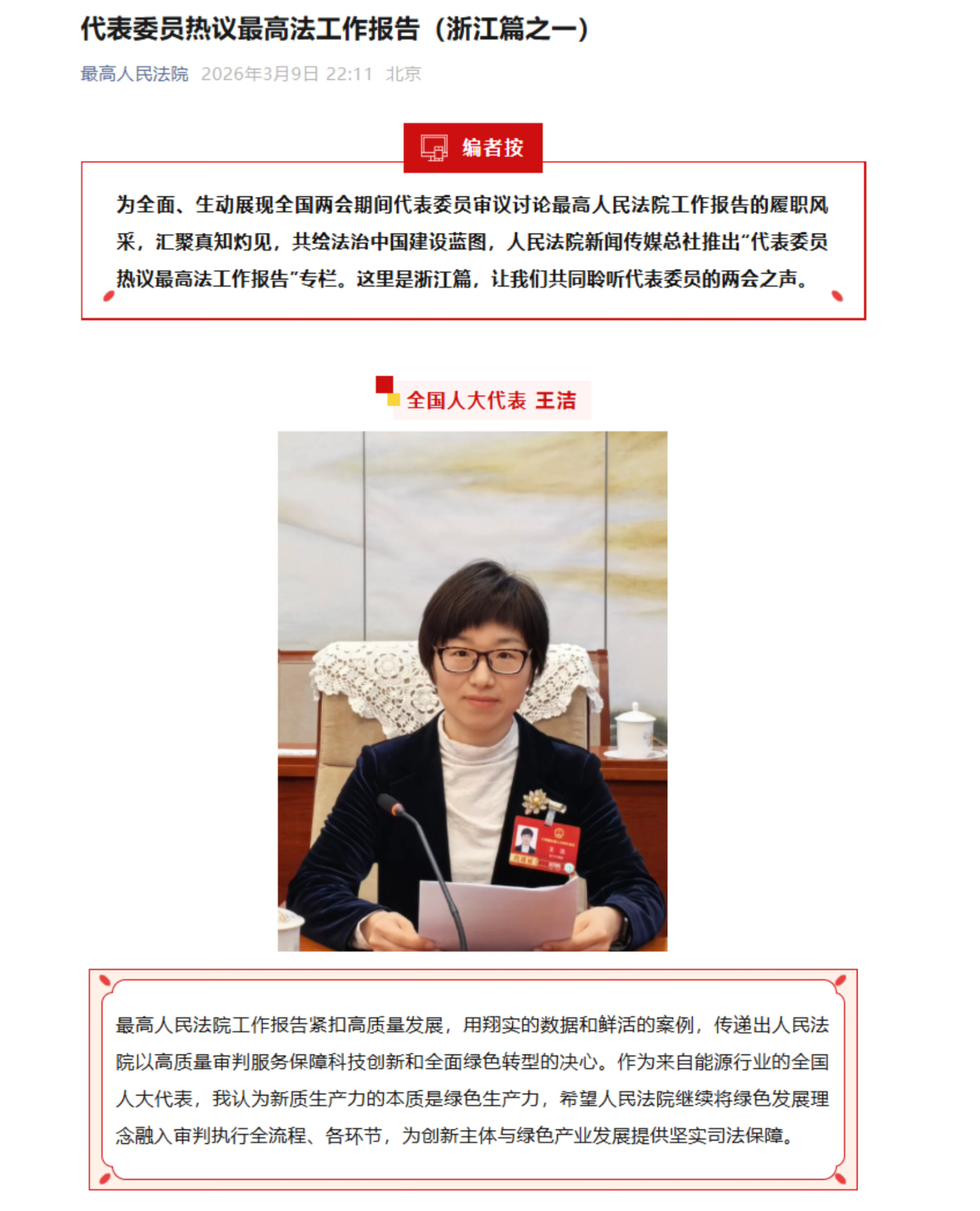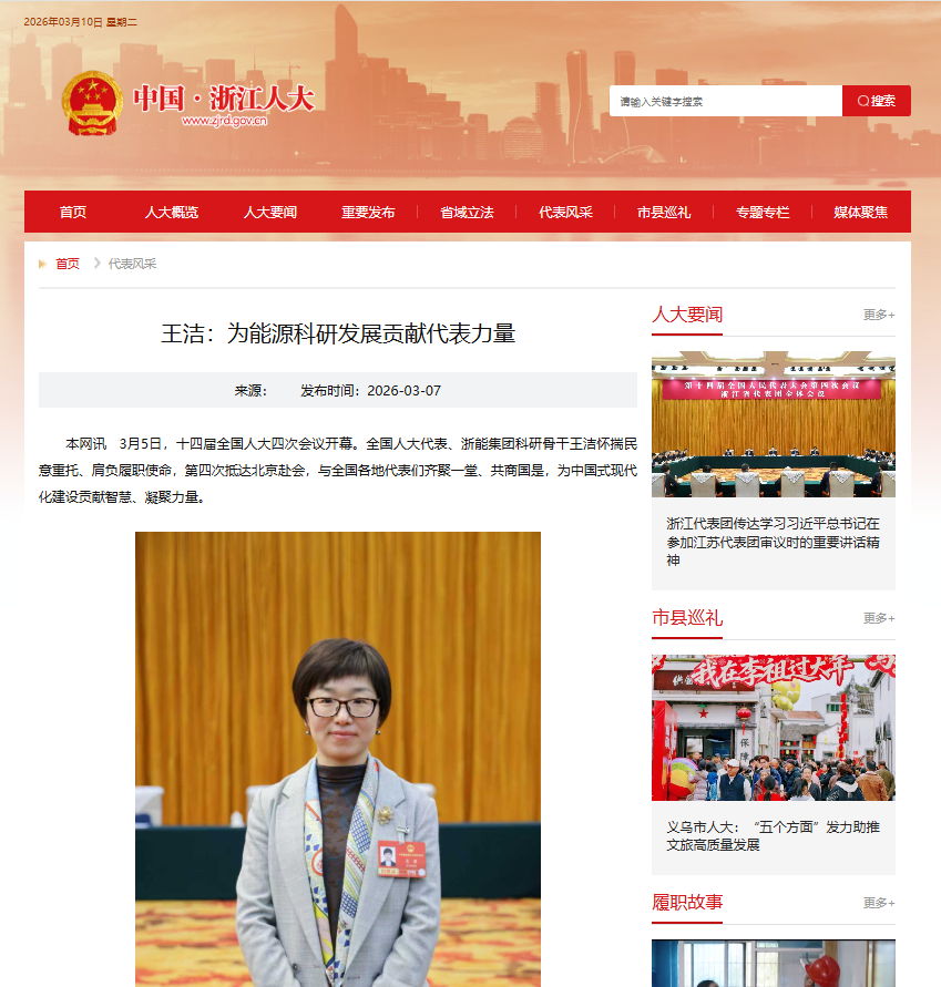 3月7日,浙江人大报道《王洁:为能源科研发展贡献代表力量》。 浙江人大 图