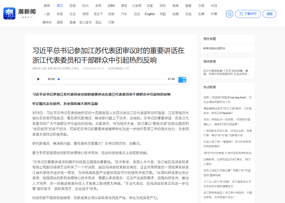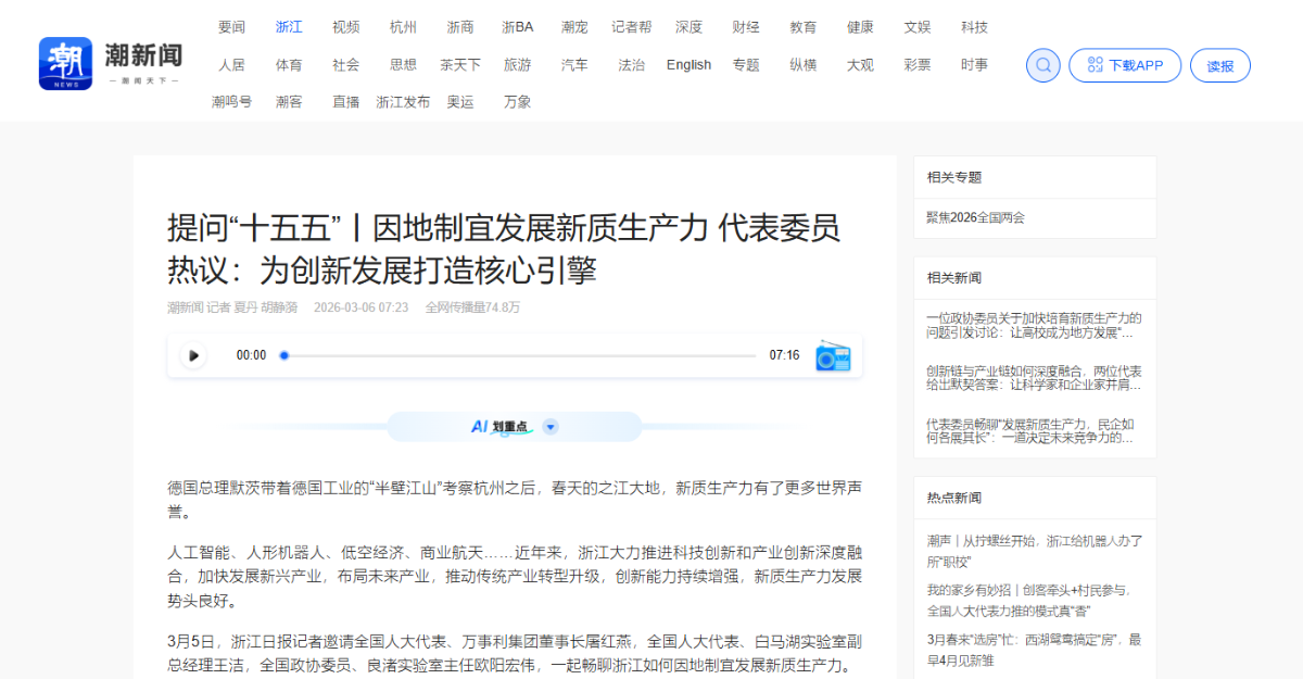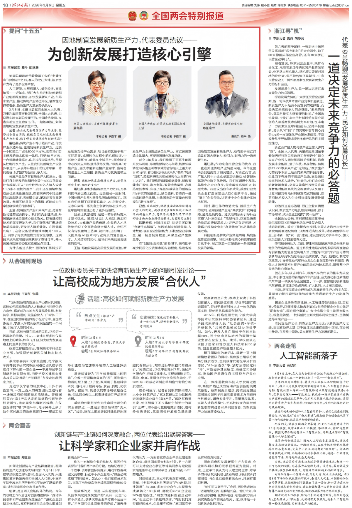 3月6日,《浙江日报》及潮新闻报道《因地制宜发展新质生产力,代表委员热议——为创新发展打造核心引擎》。 《浙江日报》、潮新闻 图
