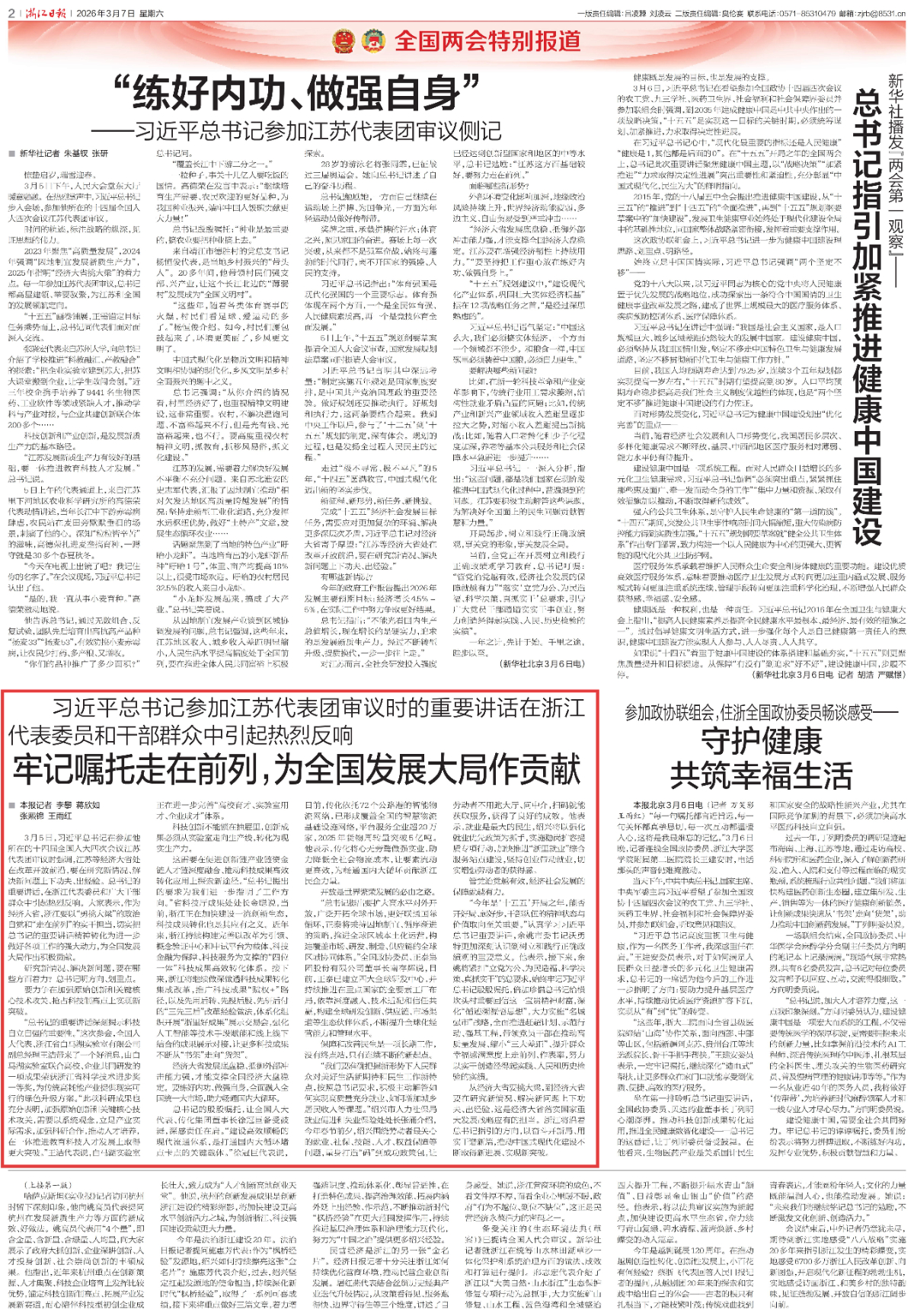 3月7日,《浙江日报》及潮新闻报道《习近平总书记参加江苏代表团审议时的重要讲话在浙江代表委员和干部群众中引起热烈反响——牢记嘱托走在前列,为全国发展大局作贡献》,采访王洁同志。 《浙江日报》、潮新闻 图