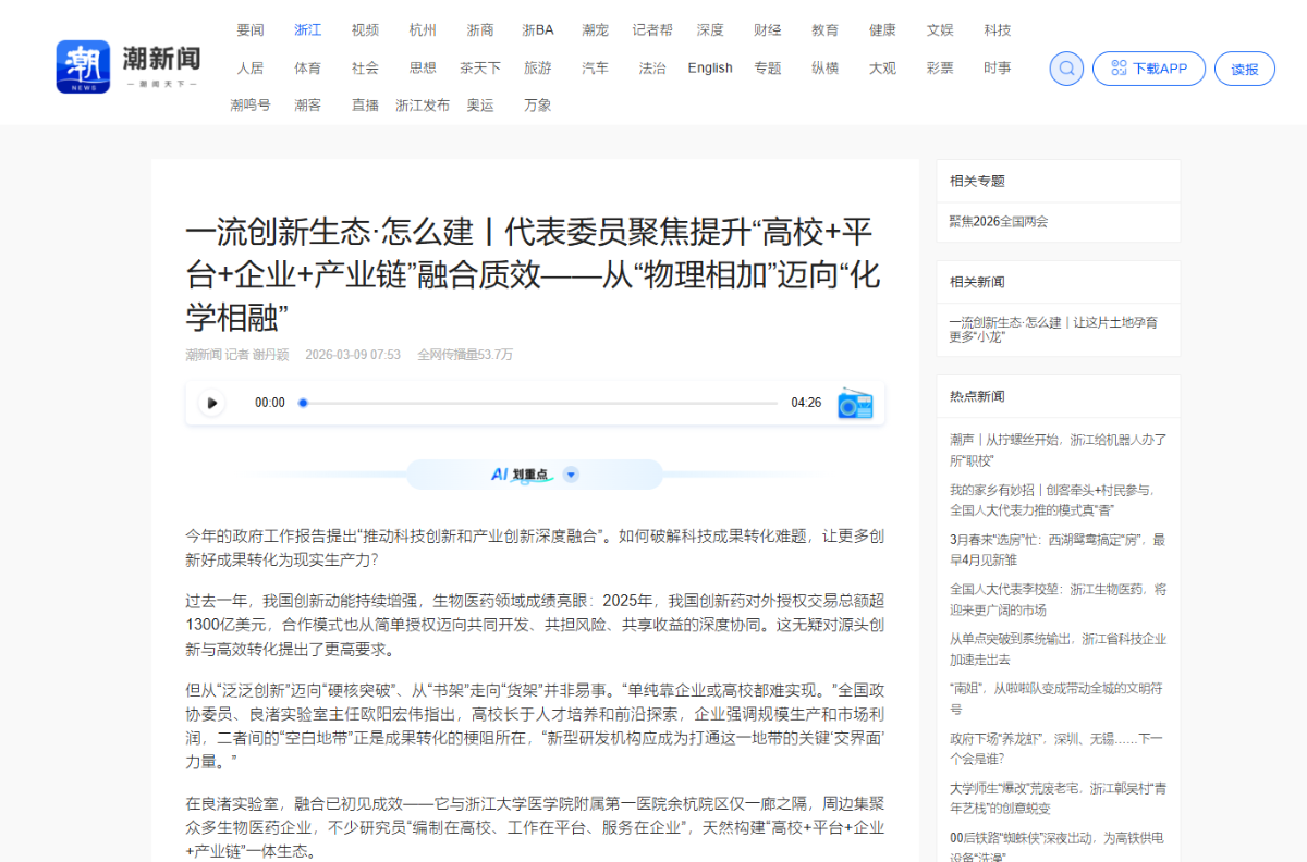 3月9日,《浙江日报》及潮新闻报道《代表委员聚焦提升“高校+平台+企业+产业链”融合质效——从“物理相加”迈向“化学相融”》。 《浙江日报》、潮新闻 图