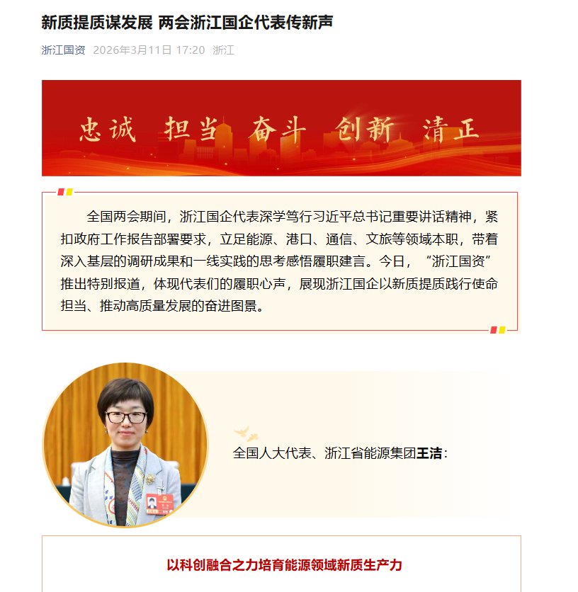 3月11日,“浙江国资”微信公众号报道《新质提质谋发展 两会浙江国企代表传新声》,就“以科创融合之力培育能源领域新质生产力”采访王洁同志。 “浙江国资”微信公众号 图