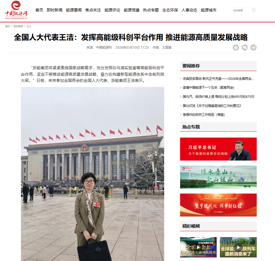 3月10日,中国能源网报道《全国人大代表王洁:发挥高能级科创平台作用 推进能源高质量发展战略》。 中国能源网 图