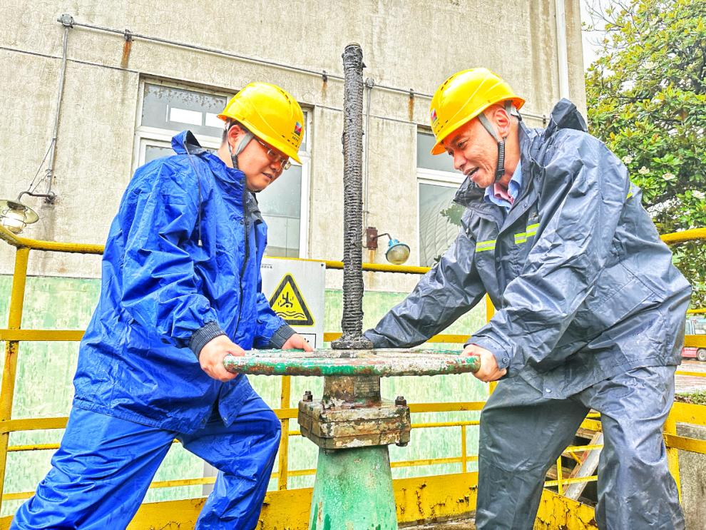 2025年台风来袭时,浙能长电党员冲锋在前,冒雨操作雨水泵房前池隔离阀。 朱海 摄