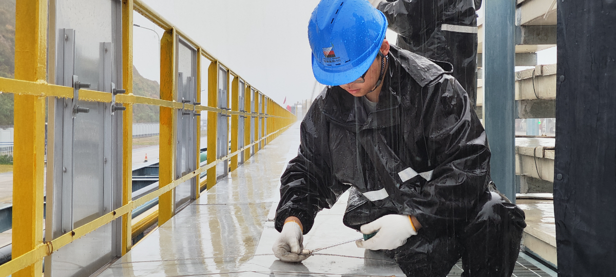 台风来临前,温州LNG公司青年突击队队员冒雨冲锋,扎实开展电缆桥架盖板紧固工作。 谢晨滢 摄