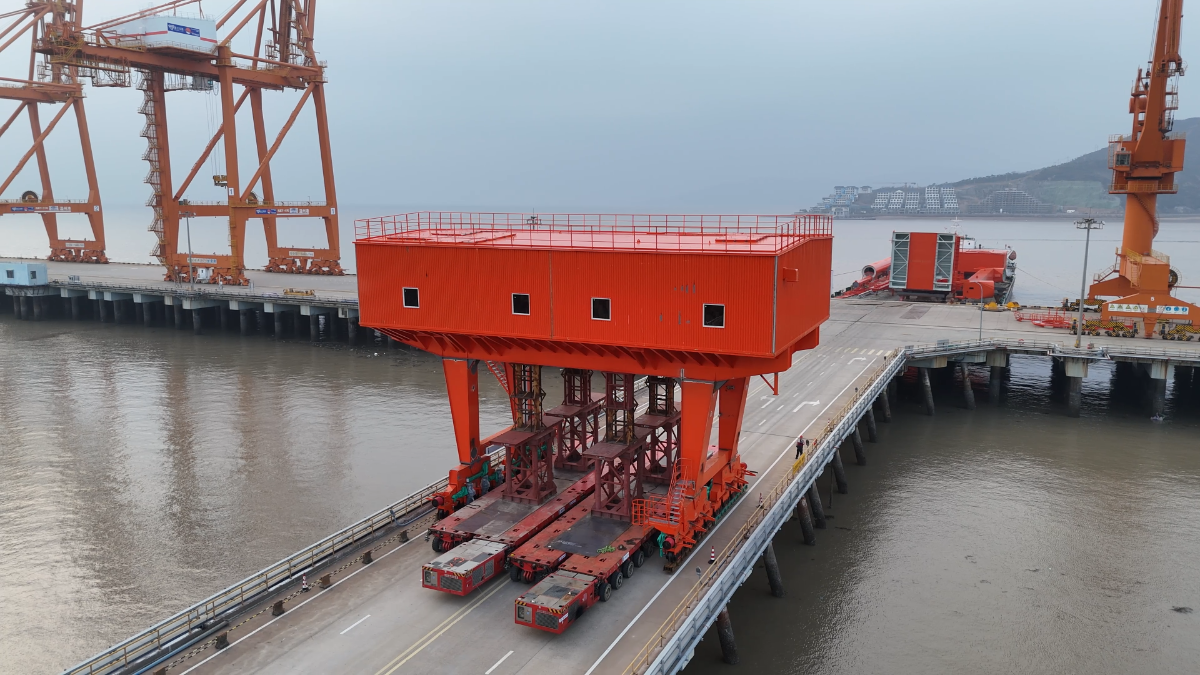 3800t—107m双主梁门式起重机核心部件在浙江(华东)深远海风电母港码头转运。 温州母港公司 提供