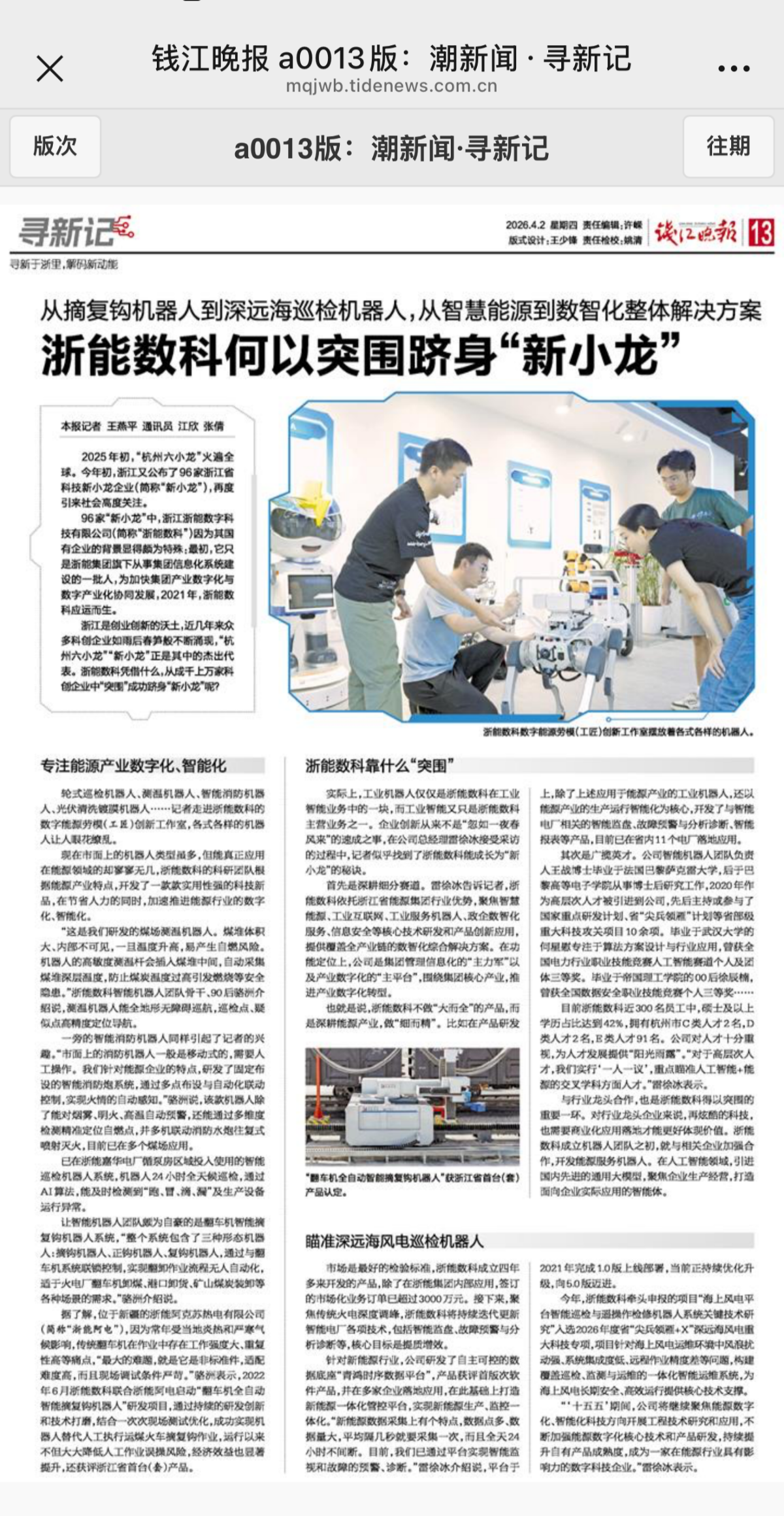 4月2日,钱江晚报 a0013版:潮新闻·寻新记报道《从摘复钩机器人到深远海巡检机器人,从智慧能源到数智化整体解决方案 浙能数科何以突围跻身“新小龙”》 浙能数科 提供