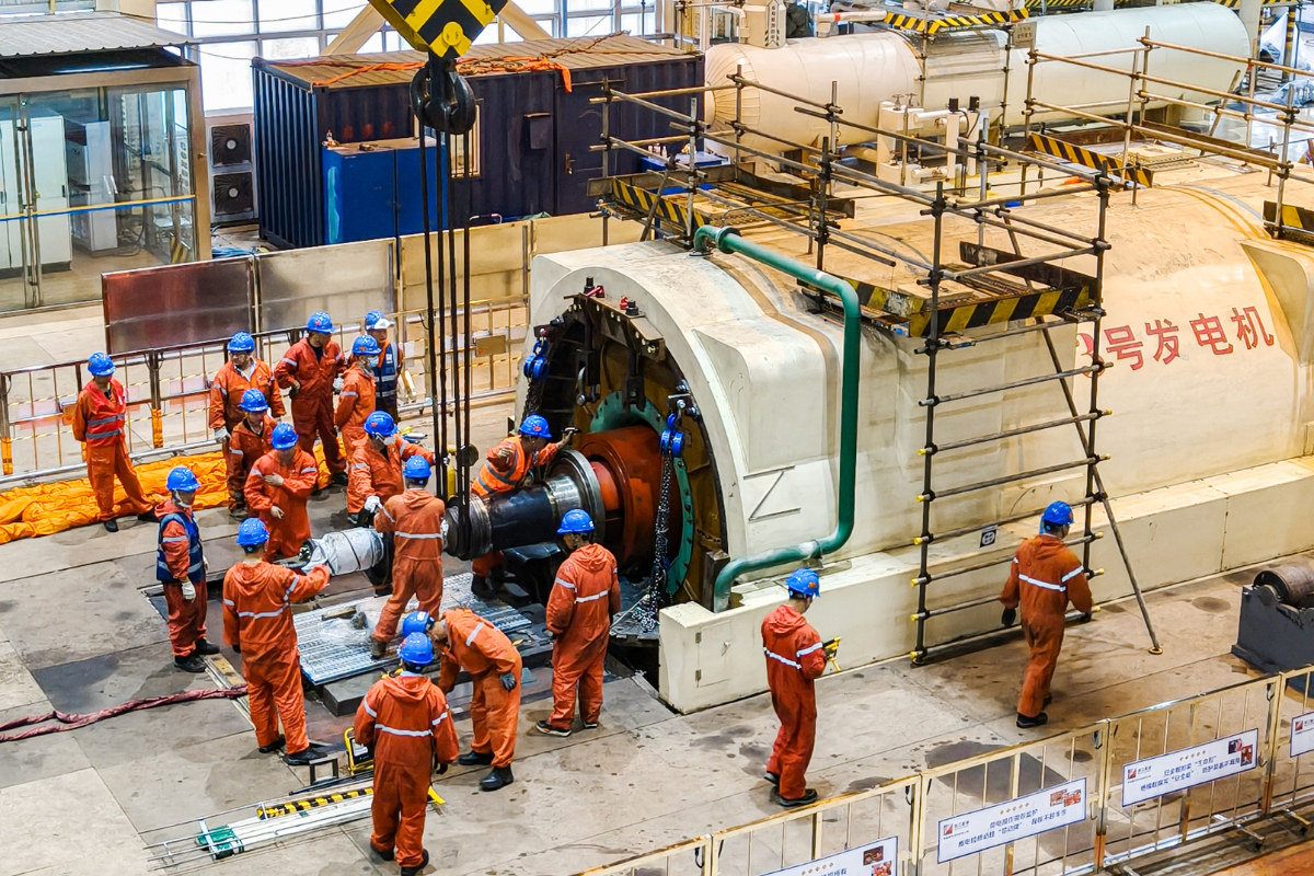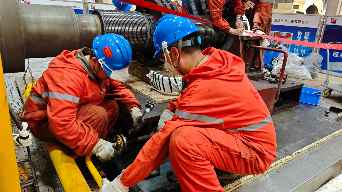 在浙能嘉华3号机组检修现场,工作人员同心协作进行抽转子作业。 沈李越 摄