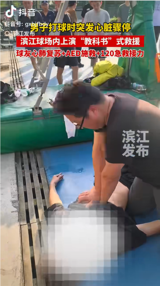 事发当天,孟建伟正在滨江球场参与运动,突见一名男子倒地不起、失去意识,且无自主呼吸。凭借平时公司培训所学的急救知识,他迅速判断为心脏骤停。千钧一发之际,孟建伟立即跪地开展急救,快速判断患者状态、清理口腔异物、开放气道,随即规范实施胸外按压;同时,他第一时间协调取来现场配备的AED设备开展除颤操作。按压、除颤、再按压……整套动作沉稳有力、节奏标准,与后续赶到的120急救人员无缝衔接,为患者的后续救治赢得了宝贵时间。现场球友用手机记录下了这一暖心瞬间,视频中孟建伟沉稳果断的救援过程,被网友纷纷点赞转发,称赞“这就是专业技能的力量!”